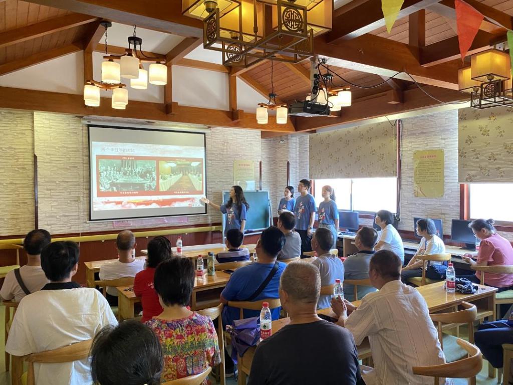 在活动过程中,宣讲团的同学组织观众观看了习近平总书记出访多国并受到高规格外交礼遇的系列视频,让观众们更直观感受到新时代中国全方位外交的成功实践,也彰显了中国不断提升的国际影响力。视频观看结束后,宣讲团同学与在场党员进行了积极互动。“如今我们的外交事业越来越好,靠的不仅是外交家的努力,更是国家的富强和民族的振兴,而国家富强和民族振兴靠的是创新和发展,这就需要你们青年一代继续努力奋斗”,现场的一位党员前辈对宣讲团成员说道。此外,一位党员前辈分享了自己在新疆的当兵经历,他指出当时的新疆虽贫困落后,但大家依然苦中作乐,同时也希望我们青年人能够继承老一辈艰苦奋斗的精神,把祖国建设得更好。