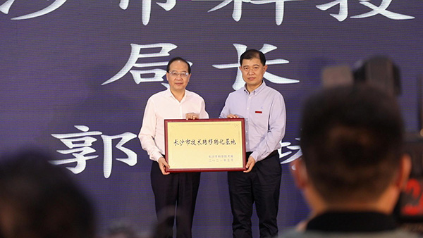 长沙市科技局党组书记、局长郭塨为我校授牌“长沙市技术转移转化基地”。